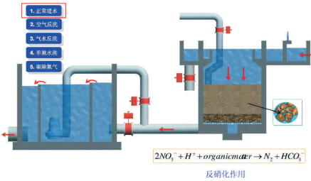 SS極好的去除構(gòu)筑物,過濾中,硝態(tài)氮通過微生物膜的作用轉(zhuǎn)化為氮?dú)馀懦?,懸浮物不斷的被截留?huì)增加水頭損失,因此需要反沖洗來去除截留的固體物。最后達(dá)到一個(gè)構(gòu)筑物具有脫氮、除磷和去除懸浮物的功能。